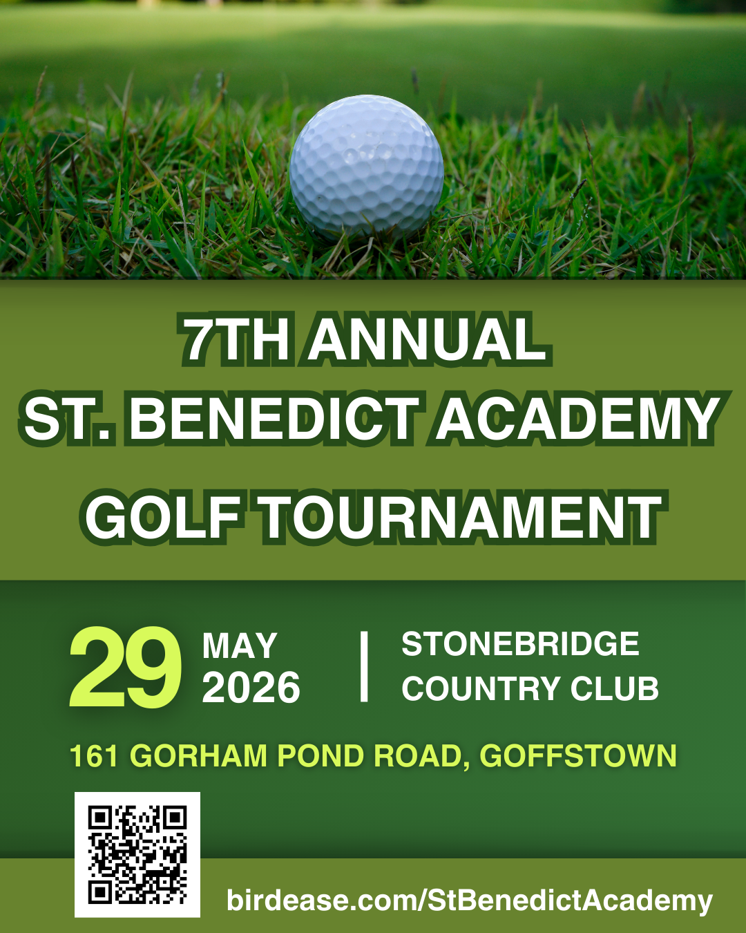 Please join us for the 7th Annual Saint Benedict Academy Golf Tournament of Friday, May 29, 2026 at Stonebridge Golf Club in Goffstown, NH.